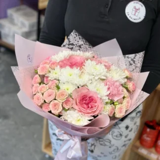 Ovaj buket se izdvaja po svom jedinstvenom spoju klasične elegancije i modernog šarma. Kombinacija roze karanfila i sitnih ruža stvara bogat i prefinjen izgled, dok gipsofila dodaje notu nežnosti i prozračnosti. Upakovan u ukrasni papir roze boje, buket odaje utisak pažljivo osmišljenog i brižno aranžiranog poklona. Mali beli meda čini ga posebnim i savršenim za sve prilike, od rođendana do romantičnih gestova.