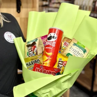 Buket Pringles je prava poslastica za ljubitelje grickalica i slatkiša, kombinujući omiljene ukuse Pringles čipsa, brusketa Marretti, M&M bombona, i Haribo gumenih bombona u impresivnom aranžmanu. Upakovane u šareni ukrasni papir, ove poslastice ne samo da izgledaju privlačno, već i obećavaju pravo uživanje u svakom zalogaju.