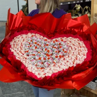 Buket srce od Kinder jaja i Raffaello kuglica je ručno izrađen sa pažnjom prema detaljima, tako da impresionira svojim dizajnom i impozantnim dimenzijama. Savršeno balansira slatkoću Kinder jaja sa delikatnom teksturom Raffaello kuglica. Obavijen u elegantni crveni ukrasni papir, odmah privlači pažnju i budi osećanja topline i radosti.