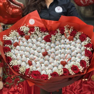 “Strast u belom” je poklon koji spaja strastvenu lepotu crvenih ruža i luksuz Ferrero Rocher čokolada, sve upakovano u elegantnu belu kutiju u obliku srca. Crvene ruže simbolizuju duboku ljubav i strast, dok Ferrero Rocher dodaje slatki dašak sofisticiranosti. Ovaj savršen spoj nežnosti i strasti čini poklon idealnim za posebne trenutke, bilo da je u pitanju romantična prilika, godišnjica ili jednostavno želja da iznenadite voljenu osobu s nečim zaista posebnim.
