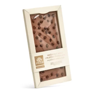 Premier bark mešavina bele i mlečne čokolade sa prženim zrnima kafe donosi savršenu kombinaciju delikatne čokoladne teksture i karakteristične kafene arome. Elegantno providno pakovanje omogućava da se prelepa zrna kafe jasno vide, dodajući estetski dodir celokupnom iskustvu. Saznajte zašto je ova kombinacija bele i mlečne čokolade s kafom postala omiljeni izbor ljubitelja handmade slatkiša.