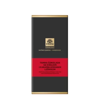 Premier tamna čokolada sa višnjom i karamelizovanim lešnikom je savršen spoj luksuza i ukusa. Dolazi u elegantnom crno zlatnom pakovanju koje odmah privlači pažnju. Sa 70% kakao delova, ova čokolada pruža dubok, bogat ukus, dok se usitnjeni karamelizovani lešnik dodatno ističe svojom hrskavošću i slatkim tonovima.